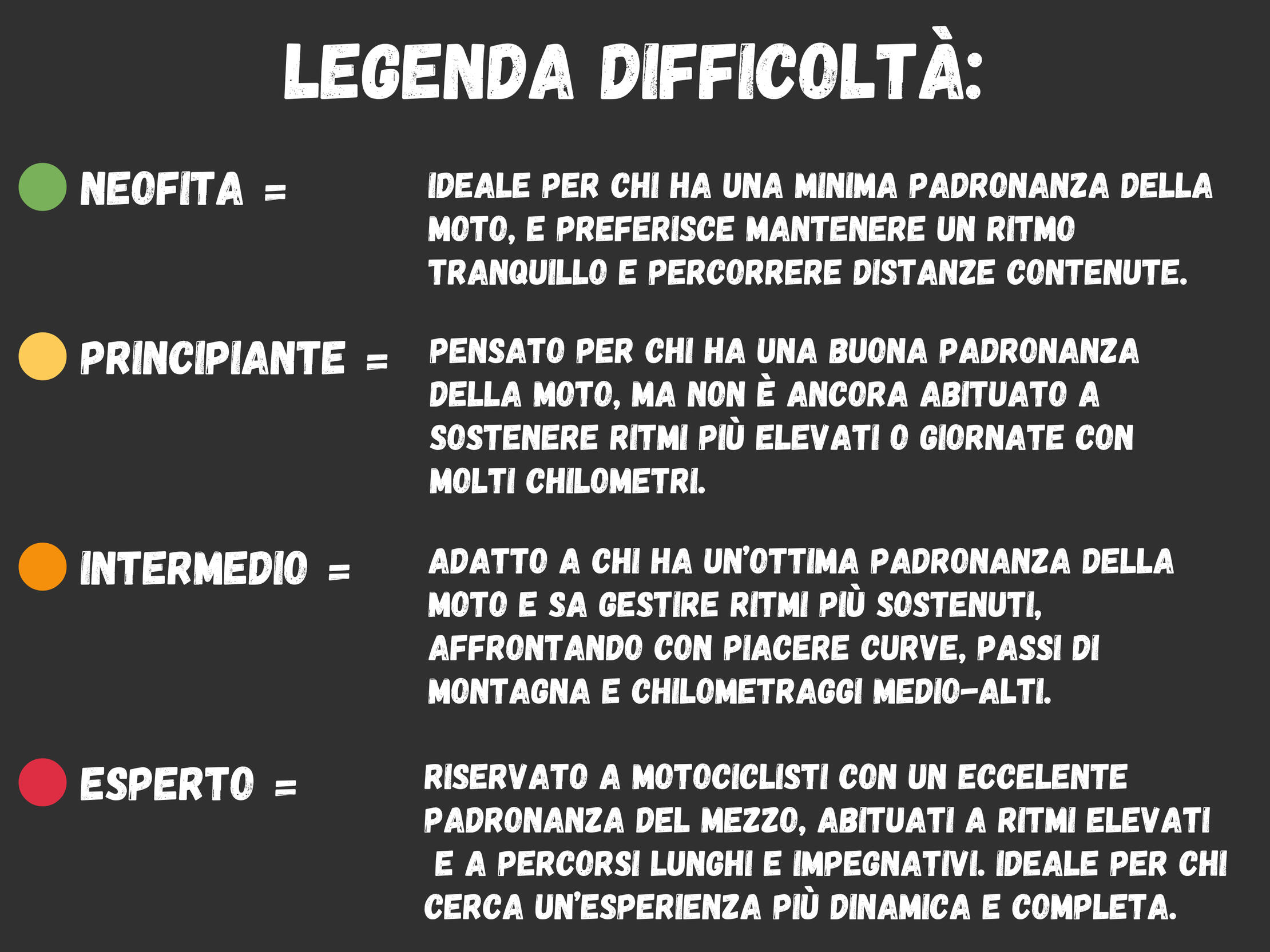 • Tutti i dettagli necessari per scegliere l’esperienza più adatta a te e al tuo modo di vivere la moto.Guarda la tabella qui sotto per scoprire i nostri 4 livelli di difficoltà: